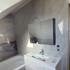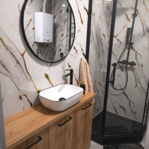 Ponieważ płyty węglowe SPC są wodoodporne, montujesz je jako okładzinę na stare płytki. Dzięki temu zyskujesz nowoczesną ścianę bez fug.