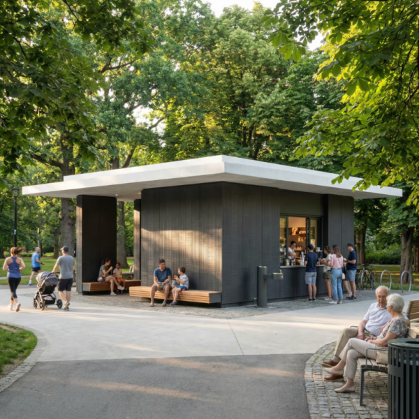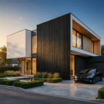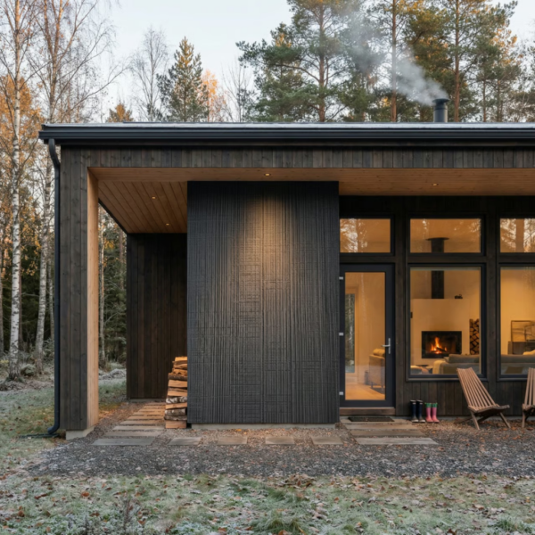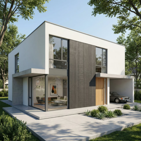 - Białe tynki i surowy beton architektoniczny – Szary panel stanowi idealne przedłużenie dla nowoczesnych, ascetycznych fasad, tworząc zbalansowaną kompozycję.